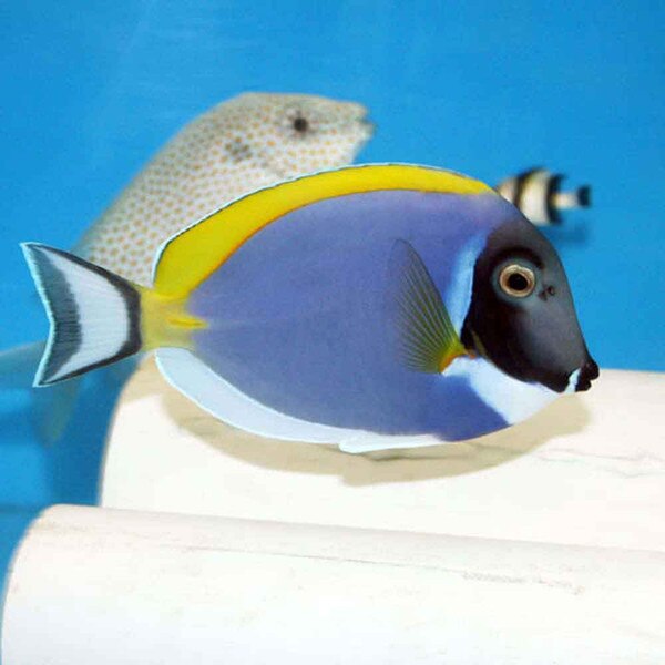 The Powder Blue Tang (Acanthurus leucosternon) gets its name from its light blue body color. The head is black and the dorsal fin and base of the tail are yellow. The chest area underneath the mouth is white and the tail is also white with black on the edge and base.