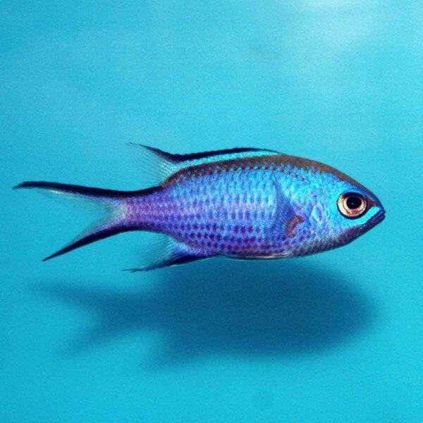 Blue Reef Chromis (Chromis cyanea) come from the Atlantic and Caribbean. They are deep blue with darker trim on the tail. While very peaceful and schooling, they can be sensitive during acclimation to a new tank.
