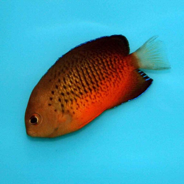 The Rusty Pygmy Angel (Centropyge ferrugata) is named for its reddish-brown body coloration. It has numerous dark spots on its sides and the stomach area is typically a brighter orange color than the rest of the body. The anal fins may have short blue stripes.
