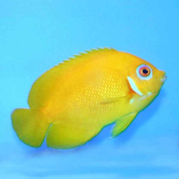 Lemonpeel Pygmy Angels (Centropyge flavissima) are bright yellow with a bright blue ring around each eye and blue on the edge of the gill cover. The edges of the fins may be blue as well, and juveniles have a blue-ringed spot on each side.