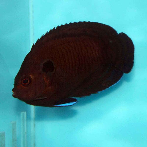 The Blue Fin Pygmy Angel (Centropyge multispinis) is a dark brown fish, sometimes referred to in the trade as a Dusky Angelfish. This species is named for the vibrant blue edges on its fins.