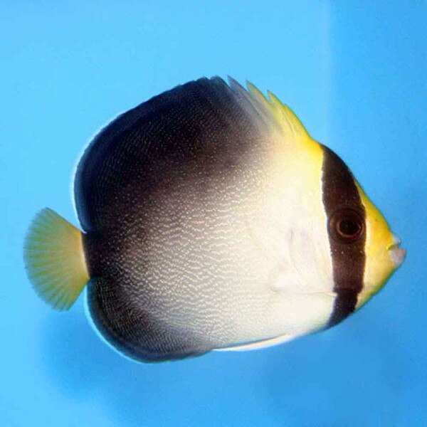 The Vermiculated Angel (Chateodontoplus mesoleucus, also known as the Singapore Angel) is predominantly white in the front and black in the back, with light blue edges on the posterior end of the dorsal and anal fins, and a yellow nose and tail. The mouth is blue. This angel is often mistaken for butterflyfish, in large part due to the black mask over its eye.