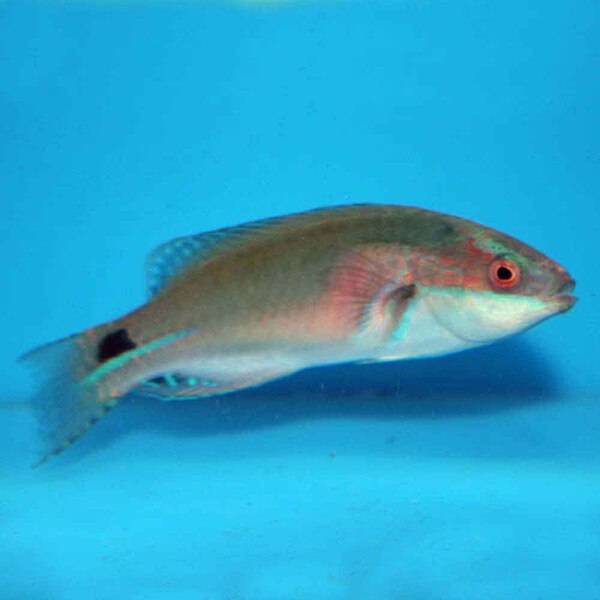 The male Exquisite Fairy Wrasse (Cirrhilabrus exquisitus) is pale gray-green with vivid pink and blue markings around the face and base of the pectoral fins. They also have a black spot at the base of the tail and anal fin, underlined with a blue streak and red in the fins. The female and juveniles are pink with a black spot at the base of the caudal fin and usually have a white spot on their "nose". Coloration can vary, depending on maturity and geographic region.