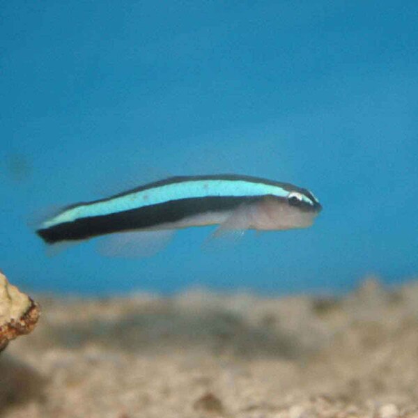 The Neon Cleaner Goby (Elacatinus oceanops, also sometimes referred to as Gobiosoma oceanops) has a black body with two blue lines that run from the snout to the tail. It is one of the most popular and well-known fish known as "Cleaner Gobies".