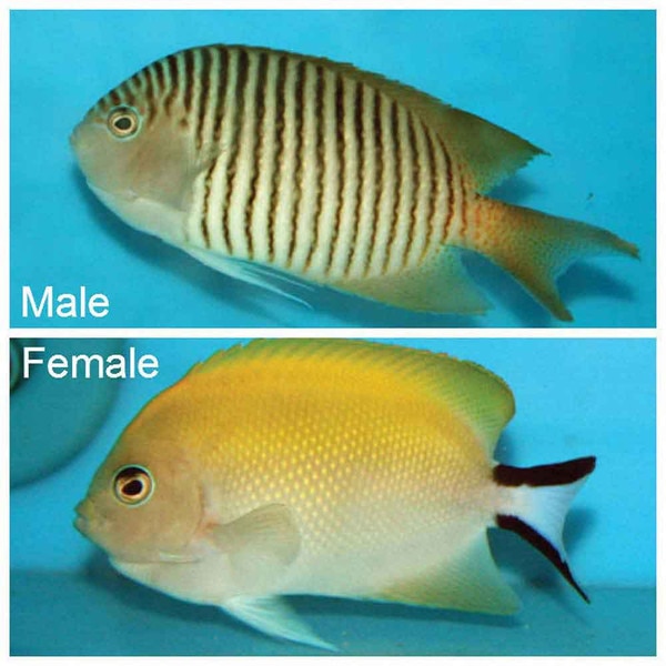 The male Blackspot Lyretail Angelfish (Genicanthus melanospilos) has numerous thin vertical brown bars on its pale grey body. It also has gold spots on its lyretail and dorsal fin. The female has a light grey face and belly, a yellow back, and light grey tail with black margins.