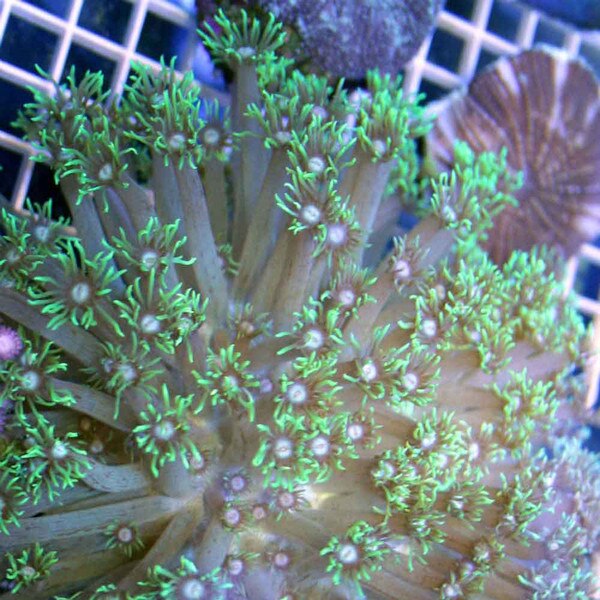 Expanded, this coral forms a ball of large tentacles, looking much like a blooming bunch of flowers. Most commonly found in shades of green or tan, rare specimens are found in red and purple. Branching structures are also sometimes found with the colonies on the ends of thick, bulbous branches.
