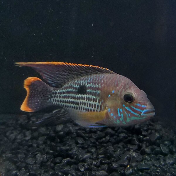 This beautiful South American cichlid makes up for its temperament with its fantastic green-blue speckles throughout its body. The Green Terror Cichlid has an interesting pattern of iridescent green-blue stripes and speckles on its face as well. The finnage is long and tipped in orange. Males develop a large bump on their head.