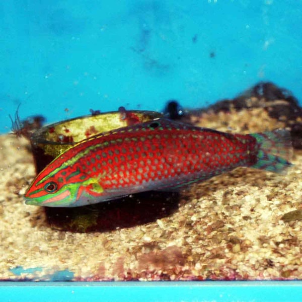 Halichoeres and Thalassoma wrasses are more active and aggressive than many other groups, especially as adults. Tankmates should be around the same size, aggression and activity level; avoid very small or docile tankmates, They should not be kept with invertebrates like crustaceans (crabs and shrimp) or feather duster worms. Some do not bother corals, but they may damage colonies as they search for food and may nip at polyps and fleshier corals. Feed a varied meaty diet of frozen and prepared foods; most wrasses will also graze on microinverts in the aquarium (copepods, amphipods, worms, etc.).
