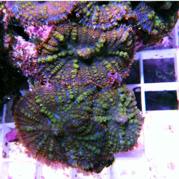 Hairy Mushrooms (Rhodactis sp.) are small, round anemones that show many different colors and patterns. Individuals form compact colonies over reef rock which resemble some hard corals. These mushroom have a hairy or beaded appearance to the surface of their disks, while the common Discosoma sp. mushrooms have a smoother surface. The color of surface can be striped, solid in color, edged with a different color, or have any other number of patterns and variations. The mushrooms range in color from brown to green to blue and in rare cases orange or red.
