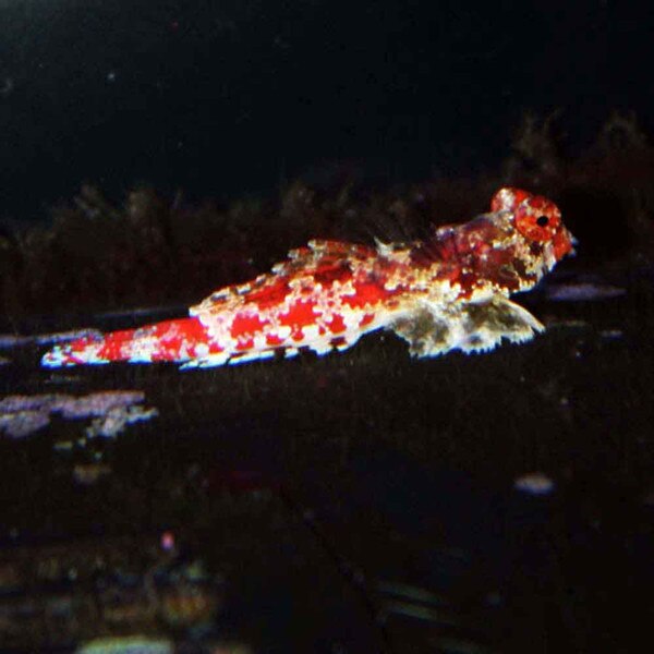 Starry Dragonets (Synchiropus stellatus) are also called Red Scooter Blennies. They have a mottled red, brown, and white coloration with a dark first dorsal fin. They are very similar in appearance to, but are much less common, than the Ocellated Dragonet, S. ocellatus.