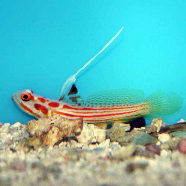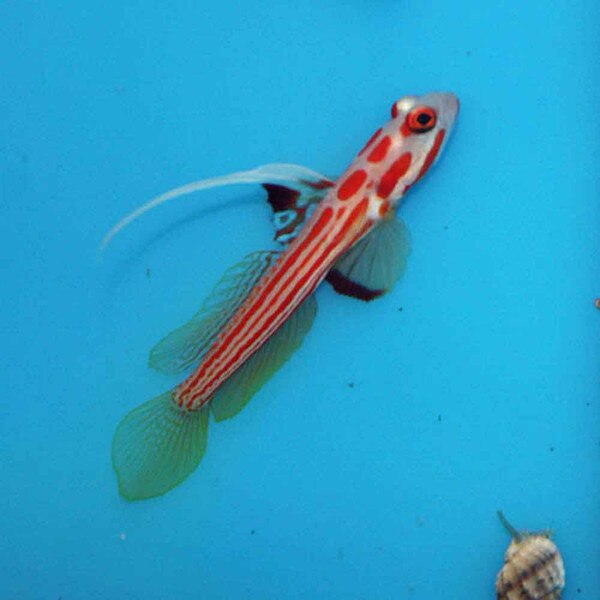 The Yasha Haza Goby (Stonogobiops yasha) is a very small, yet ornately colored shrimpgoby and is fantastic for small reef or species tanks. They have white bodies with red horizontal stripes, and a tall first dorsal spine. Their eyes are yellow.