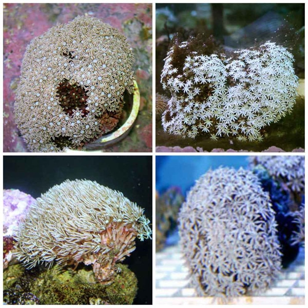 Pipe Organ Coral (Tubipora musica) is a soft coral with hard exoskeleton. The exoskeleton is made up of calcareous tubes that are characteristically red to maroon in color. The polyps that extend from them are white, tan, grey or green and look like flowers with feather petals. Very rarely, the polyps may have smooth "petals" or centers of a different color. There are many different shapes and forms of Tubipora musica that some argue may lead to them being separated into different species. Pipe Organ colonies may resemble other corals like Clavularia, Briareum, Pachyclavularia, and Alveopora.