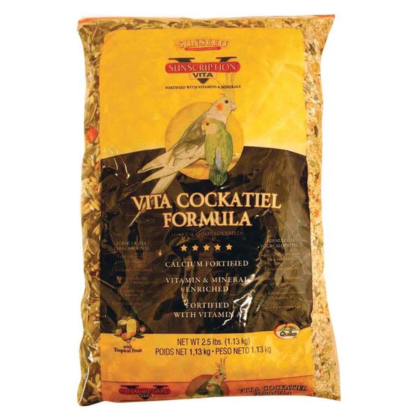 Sun Seed Vita Cockatiel Formula with Tropical Fruit is specially prepared to be a part of a well balanced diet. Vita Cockatiel is scented with the essence of real orange and fortified with essential vitamins, minerals and the natural goodness of bananas, raisins, papaya, pineapple, coconut, apple and carrot.