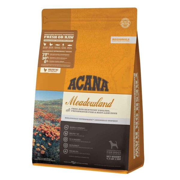 Loaded with quality animal ingredients, ACANA Meadowland has the rich protein that your dog is biologically adapted to thrive on. WholePrey ratios of free-run chicken and turkey, and wild-caught blue catfish and rainbow trout, plus cage-free eggs, deliver the nutrients your dog requires in order to stay happy, healthy, and strong.