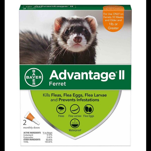 Advantage II Ferret once-a-month topical flea prevention and treatment helps rid your ferret of painful, irritating fleas. It is a vet-recommended, leading brand in pet flea protection. This treatment kills adult fleas, flea larvae and flea eggs to deliver total flea protection to your ferret. Within 24 hours of application, Advantage II Ferret topical treatment gets straight to work killing fleas through contact. This treatment works hard for 30 days following application, effectively breaking the flea life cycle, controlling existing flea infestations and preventing further infestations all month long. This convenient, spot-on application goes on the back of your ferret’s neck at the base of the skull. You simply place the tip of the tube on the skin and squeeze the tube to expel the entire contents directly on the skin. It goes on in seconds! It's easier than a flea collar and there are no hard-to-swallow pills. Advantage II Ferret is fragrance-free and waterproof after 24 hours of application. Check the product label for information about application and potential side effects. For the ultimate convenience in care. Your ferret should be at least 10 weeks old and weigh at least 1 lb. to use Advantage II Ferret.