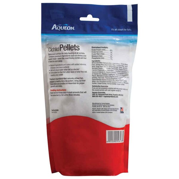 Aqueon Cichlid Pellets have been developed using premium ingredients. These foods contain only natural ingredients and contain no artificial colors, only those the ingredients contribute. Natural pigments from krill, shrimp and other premium ingredients help to bring out the natural colors in your fish. Added vitamins, minerals and trace nutrients increase the vitality of your fish and boost immunity. Formulated so that fish utilize more of what they eat, creating less waste, will not cloud water if fed as directed.