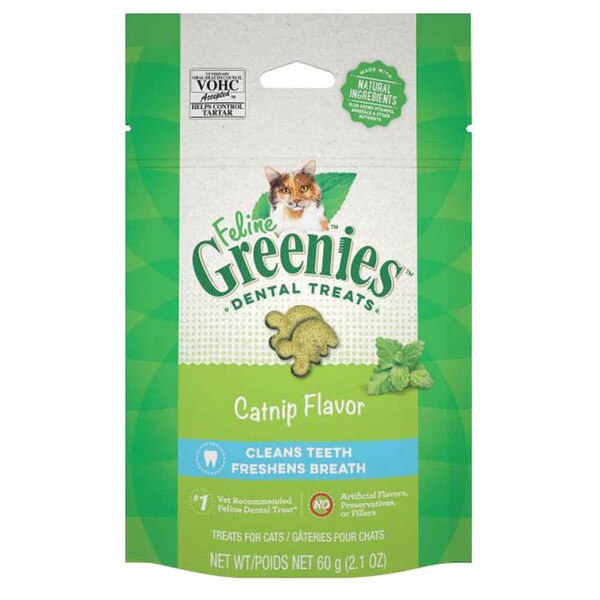 Oral health issues are the most common health problems diagnosed in adult pets.** FELINE GREENIES Dental Treats have a specially formulated crunchy texture that is designed to reduce tartar buildup. Plus, with an irresistible taste, they are sure to stir up purrs of joy. These treats are nutritionally complete and balanced for adult cats, and at less than 2 calories per treat, they’re designed for daily treating. Cat dental care has never been easier — or more delicious. Treat your cat to clean teeth and fresh breath!
