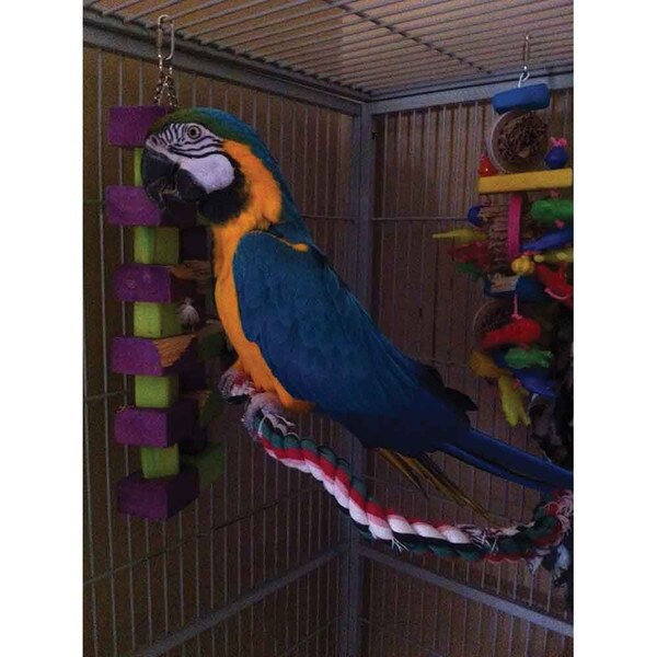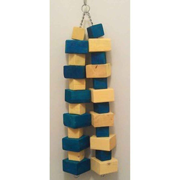 Graham’s Bird Toy Lisa’s Doubles measures approx. 22 inches long by 5.5 inches wide. Wooden blocks measure 1-1/2 inches x 1-1/2 inches and 2 inches x 2 inches. Great toy for Cockatoos and Macaws. Wooden blocks are strung on nickel plated chain.