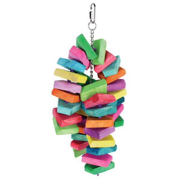 Graham's Bird Toy Creations Mas Tequila Double is chuck full of wooden shapes that are 1 inch thick. Strung on superior poly rope. Perfect for medium birds.