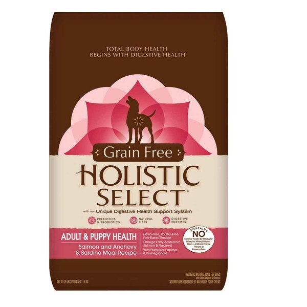 Holistic Select Grain Free Adult & Puppy Health Salmon and Anchovy & Sardine Meal Recipe is formulated to meet the nutritional levels established by the Association of American Feed Control Officials (AAFCO) Dog Food Nutrient Profiles for all life stages except for large size dogs (70 lbs or more as an adult).