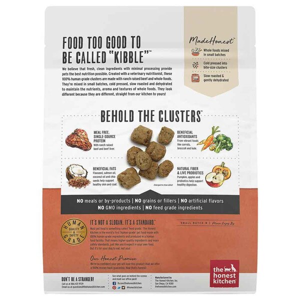 FOOD TOO GOOD TO BE CALLED KIBBLE - At The Honest Kitchen, we believe that fresh, clean ingredients with minimal processing provides pets the best nutrition possible. So, when we set out to create a kibble with the same passion and principals, we knew it wouldn't be brown and round like the others. These whole food clusters look different because they are different. They're made in small batches, cold pressed and then slow roasted & dehydrated to keep the nutrients, aroma and textures of the whole foods alive. The result is kibble without compromise, from our kitchen to yours.