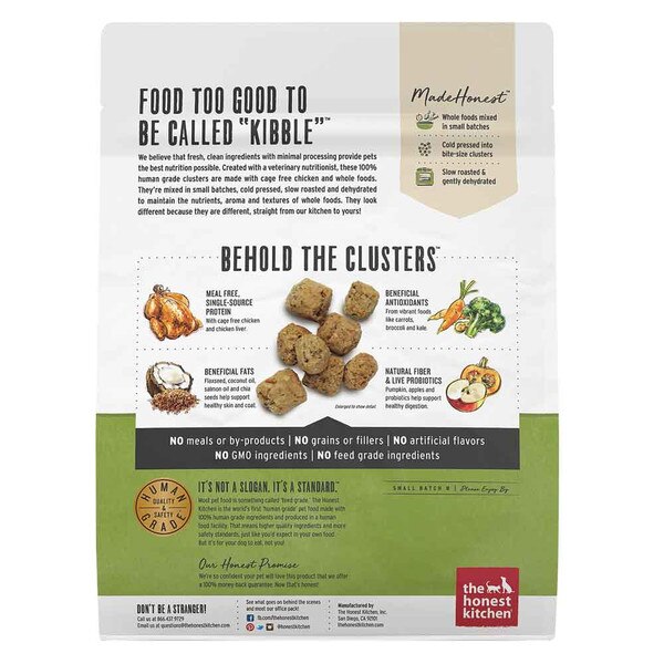 FOOD TOO GOOD TO BE CALLED KIBBLE - At The Honest Kitchen, we believe that fresh, clean ingredients with minimal processing provides pets the best nutrition possible. So, when we set out to create a kibble with the same passion and principals, we knew it wouldn't be brown and round like the others. These whole food clusters look different because they are different. They're made in small batches, cold pressed and then slow roasted & dehydrated to keep the nutrients, aroma and textures of the whole foods alive. The result is kibble without compromise, from our kitchen to yours.