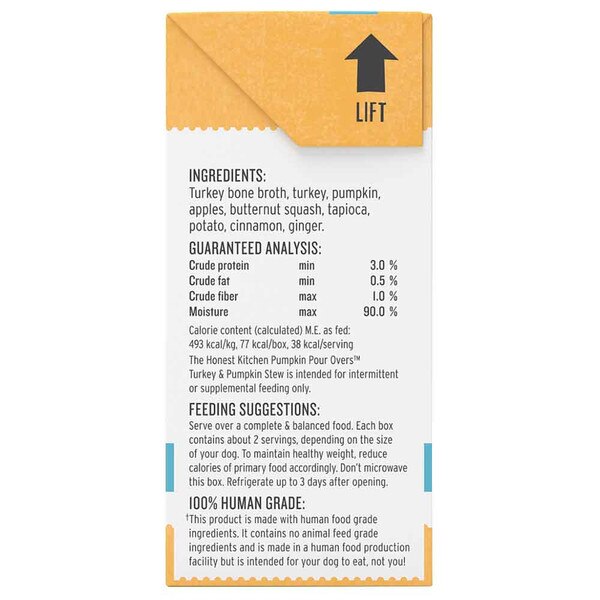 Crude Protein (min) 3.5%, Crude Fat (min) 1%, Crude Fiber (max) 1%, Moisture (max) 90% The Honest Kitchen Pour Overs™ are intended for intermittent or supplemental feeding only. This is a complementary food that should be fed along with a complete and balanced diet.