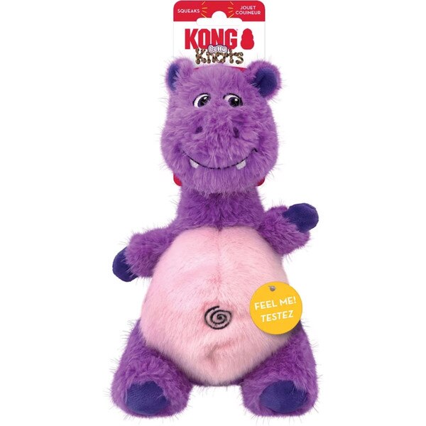 KONG Knots Belly Hippo is soft and cuddly on the outside with a strong, durable rope ball on the inside making its belly round and weighty. This dense internal skeleton rope ball adds heft and movement that entices instinctual thrashing, flinging, and light chewing. A squeaker in this purple hippo’s head piques dogs’ interest and adds excitement to play sessions. Knots Belly Hippo is also ideal for dogs who like to carry their toys, as well as for naptime snuggles. Have fun watching which way your dog likes to engage with this multifunctional toy!