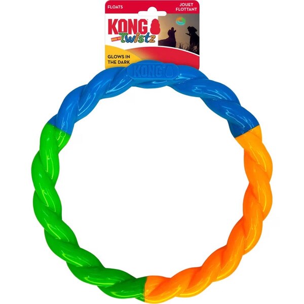 KONG Twistz High-Viz Ring’s vibrant, highly visible colors make this the perfect toy for all outdoor environments, weather, and terrain. This twisted ring is easy-to-grip, with bright colors that stand out in tall grass, at the pool, in snow, on dreary days—even at night with glow-in-the-dark technology. Durable material gives the Twistz High-Viz Ring a dynamic bounce and long-distance rolling action. Charge the Ring under a lamp or in the sunlight for glowing fun.
