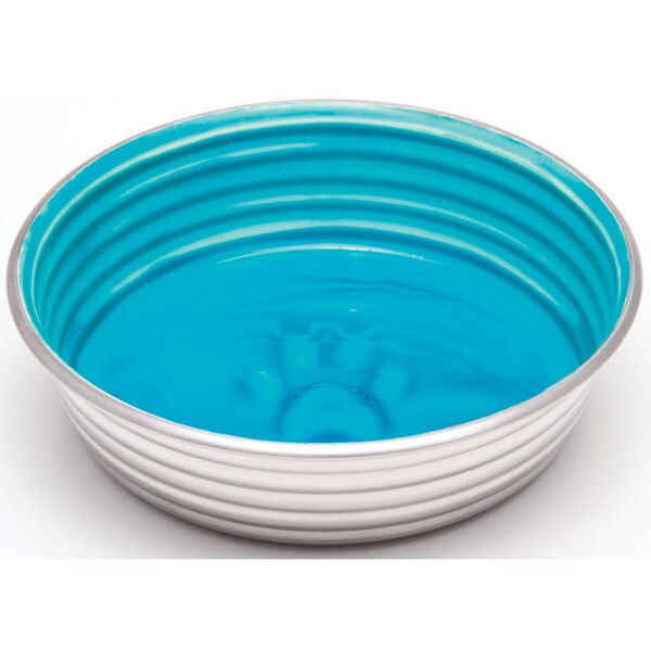 Le Bol Dog Bowls - Seine Blueare not only gorgeous, they are extremely durable. Created in the style of famous French cookware, these stainless steel bowls have a brightly colored ceramic-like interior. The glazed overstain effect highlights the ribbed walls and embossed paw in the bottom. The integrated rubber base makes them skid and noise-free. And of course, they are top-rack dishwasher safe.