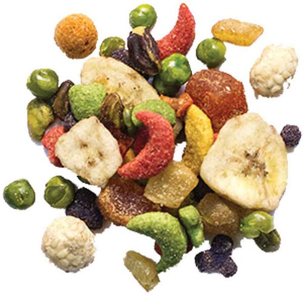 Canary grass seeds, Millet, Red milo, White milo, Canola, Ground corn, Dried carrots, Dried peas, Dried bananas, Soybean meal, Ground wheat, Sugar, Wheat germ meal, Vegetable oil (preserved with mixed tocopherols), Calcium carbonate, Dicalcium phosphate, Salt, Natural flavors, DL-Methionine, Dried oranges, Dried apples, Dried grapes, Choline chloride, L-Lysine monohydrochloride, Vitamins (Vitamin E supplement, Niacin supplement, Biotin, d-Calcium pantothenate, Riboflavin supplement, Pyridoxine hydrochloride, Thiamine mononitrate, Vitamin A acetate, Vitamin D3 supplement, Menadione sodium bisulfite complex (source of Vitamin K activity), Vitamin B12 supplement, Folic acid), Citric acid (preservative), Mixed tocopherols (preservative), Yellow 5, L-ascorbyl-2-polyphosphate, Red 40, Yellow 6, Minerals (Manganous oxide, Zinc oxide, Copper sulfate, Sodium selenite, Calcium iodate), Color added, Blue 1