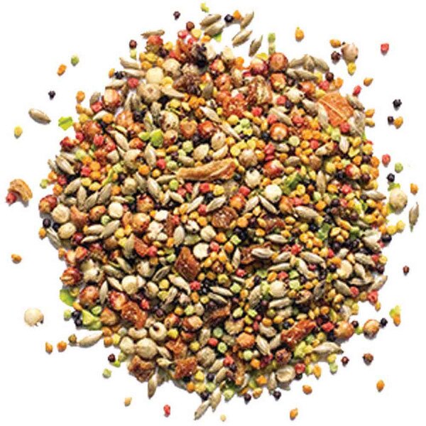 Canary grass seeds, Millet, Red milo, White milo, Canola, Ground corn, Dried carrots, Dried peas, Dried bananas, Soybean meal, Ground wheat, Sugar, Wheat germ meal, Vegetable oil (preserved with mixed tocopherols), Calcium carbonate, Dicalcium phosphate, Salt, Natural flavors, DL-Methionine, Dried oranges, Dried apples, Dried grapes, Choline chloride, L-Lysine monohydrochloride, Vitamins (Vitamin E supplement, Niacin supplement, Biotin, d-Calcium pantothenate, Riboflavin supplement, Pyridoxine hydrochloride, Thiamine mononitrate, Vitamin A acetate, Vitamin D3 supplement, Menadione sodium bisulfite complex (source of Vitamin K activity), Vitamin B12 supplement, Folic acid), Citric acid (preservative), Mixed tocopherols (preservative), Yellow 5, L-ascorbyl-2-polyphosphate, Red 40, Yellow 6, Minerals (Manganous oxide, Zinc oxide, Copper sulfate, Sodium selenite, Calcium iodate), Color added, Blue 1