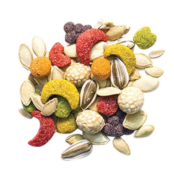 Canary grass seeds, White milo, White proso millet, Ground corn, Canola, Soybean meal, Ground wheat, Wheat germ meal, Sugar, Vegetable oil (preserved with mixed tocopherols), Calcium carbonate, Dicalcium phosphate, Iodized salt, Natural flavors, DL-Methionine, Dried oranges, Dried apples, Dried grapes, Dried bananas, Choline chloride, L-Lysine monohydrochloride, Vitamins (Vitamin E supplement, Niacin supplement, Biotin, d-Calcium pantothenate, Riboflavin supplement, Pyridoxine hydrochloride, Thiamine mononitrate, Vitamin A acetate, Vitamin D3 supplement, Menadione sodium bisulfite complex (source of Vitamin K activity), Vitamin B12 supplement, Folic acid), Citric acid (preservative), Mixed tocopherols (preservative), Yellow 5, L-ascorbyl-2-polyphosphate, Red 40, Yellow 6, Minerals (Manganous oxide, Zinc oxide, Copper sulfate, Sodium selenite, Calcium iodate), Color added, Blue 1