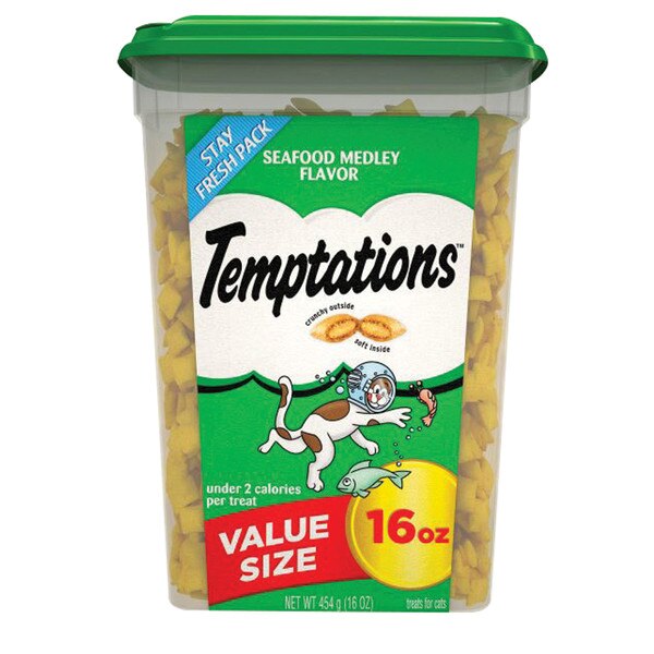 With a crunchy outside and soft center, TEMPTATIONS Seafood Medley Flavor Cat Treats are 100% nutritionally complete and have no artificial flavors. Your cat will enjoy the delicious combination of seafood flavors in every bite.