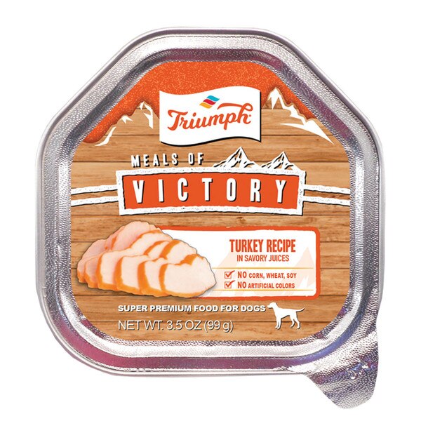 Triumph Meals of Victory Turkey Recipe in Savory Juices Dog Food is made with select wholesome ingredients and slowly cooked to mouthwatering perfection. Great as a stand-alone meal for smaller furry friends, or a dry food topper that will get those paws begging for dinner time! Your best friend will love the taste, quality, and nutrition that comes with this meal of sweet victory. Awaken your dog's Free Spirit!