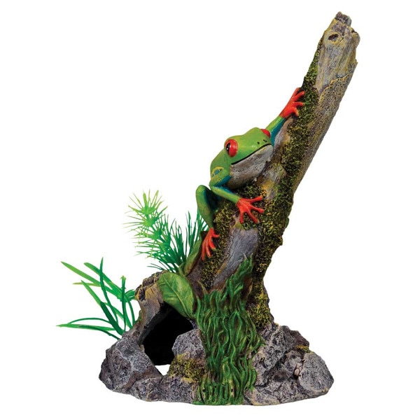 Underwater Treasures Tree Frog on Stump is an adorable addition to your freshwater or saltwater aquarium set up. Has a cave for your fish to explore.