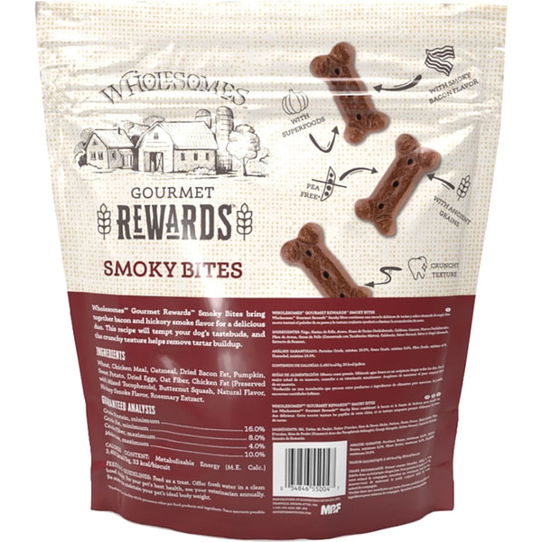 Wholesomes Smoky Bites Bacon Flavor Dog Treats are a great way to reward your pup while providing a delicious supplement to his diet. These treats are made with a smoky, bacon flavor dogs love and have a crunchy texture that helps remove plaque and tartar to support healthy gums. And you’ll be happy to know that every biscuit is naturally preserved and fortified with vitamins and minerals for an added boost of benefits!