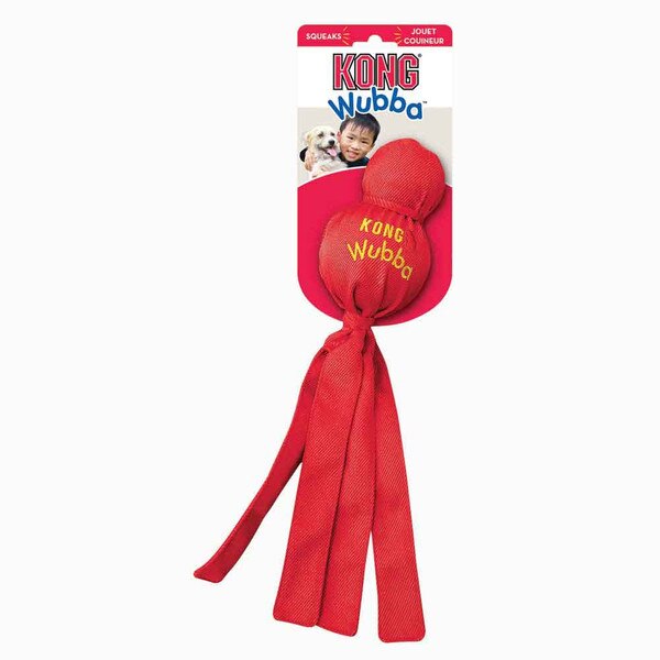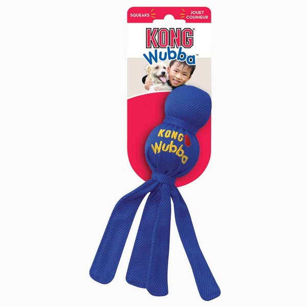 The KONG Wubba is a fun, interactive toss and tug toy. Durable reinforced nylon fabric covers two balls - a tennis ball on top and a squeaker ball beneath. The long tails make it easy to pick up and throw. Dogs love to squeak the Wubba and shake the flapping tails back and forth.