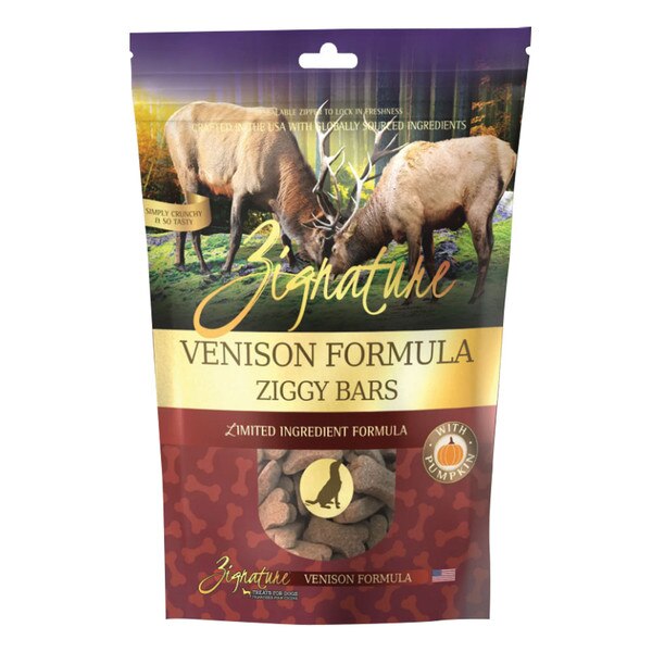 Zignature Venison Ziggy Bars make training time more fun! These tasty treats are formulated with the same limited ingredient philosophy as our dry and canned foods and include healthy, wholesome ingredients like pumpkin to make treat time much more enjoyable for you and your furry friend!