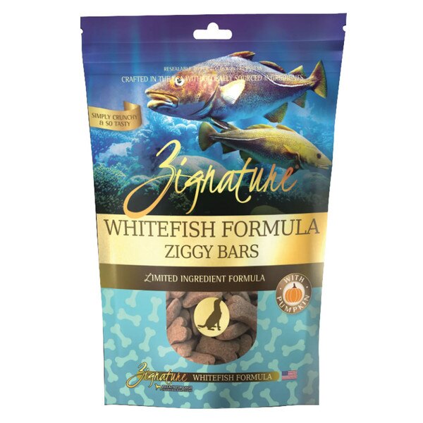 Zignature Whitefish Ziggy Bars make training time more fun! These tasty treats are formulated with the same limited ingredient philosophy as our dry and canned foods and include healthy, wholesome ingredients like pumpkin to make treat time much more enjoyable for you and your furry friend!