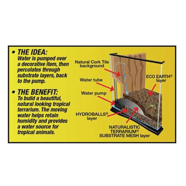 Take your terrarium to the next level with Zoo Med’s Naturalistic Terrarium™ Waterfall Kit! Incorporate a beautiful waterfall feature in your Naturalistic Terrarium™! The included instruction booklet provides helpful ideas on setting up this water feature and incorporating beautiful plants and other decorations. Includes: